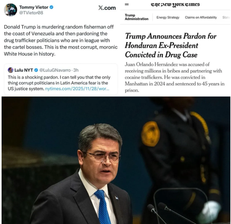 While Trump’s military kills unidentified fishermen with missiles with the goal of “ending drug trafficking,” he pardoned Juan Orlando Hernandez, an actual criminal ex-president convicted of money laundering and tied to drug-running networks.